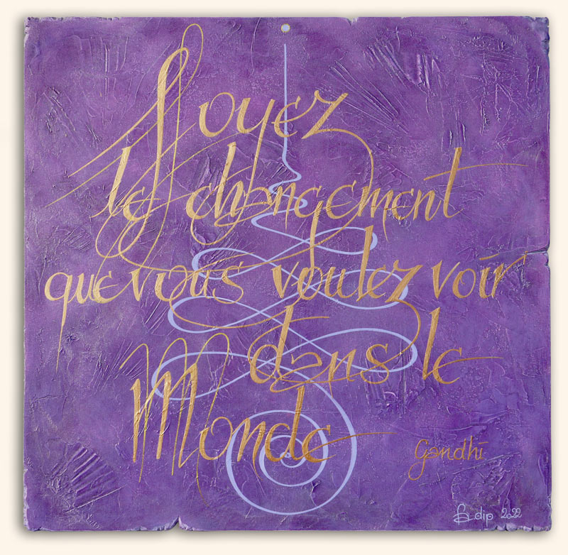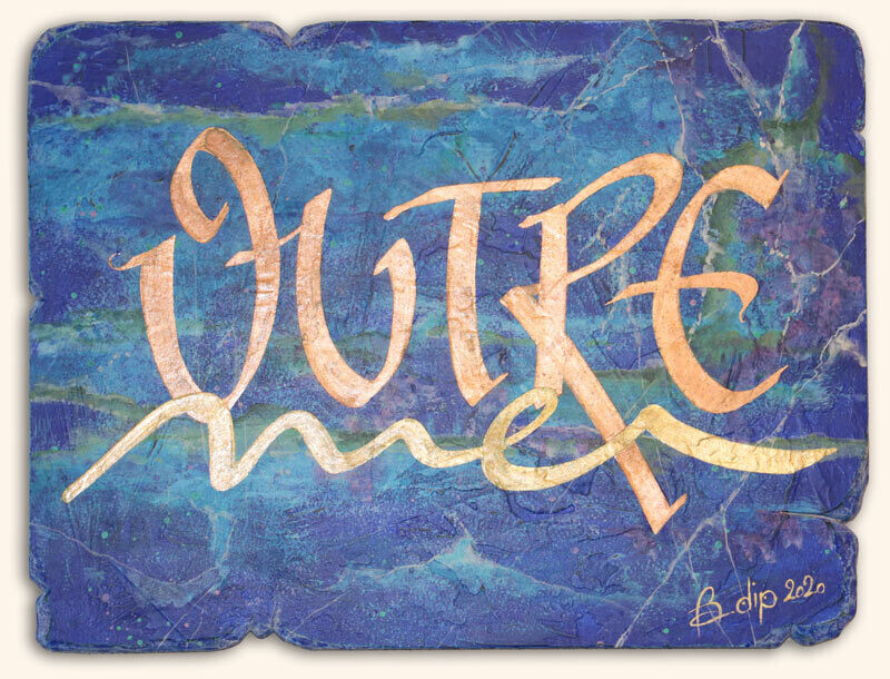 Non, je peins à l’acrylique. Et comme j’ai appris à travailler les feuilles d’or, d’argent et de cuivre, je les intègre parfois à mes tableaux. Et puis, il y a aussi ma spécialité: les lettres !